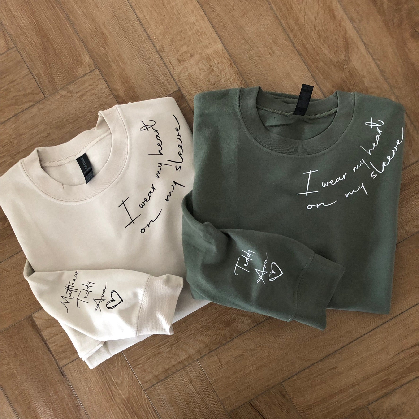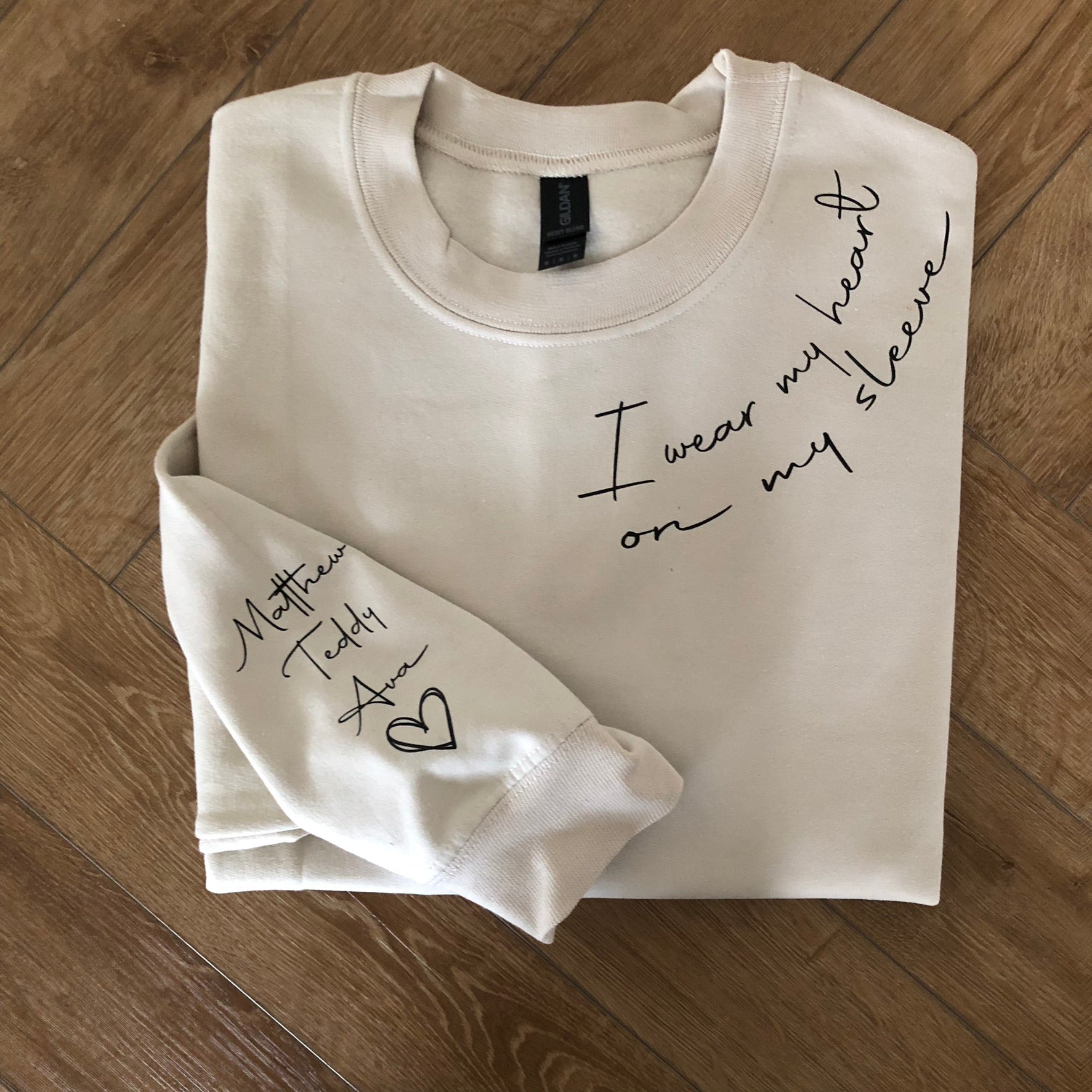 I Wear Heart on My Sleeve Sweatshirt Personalised Kids Names on Sleeve Mum Sweater